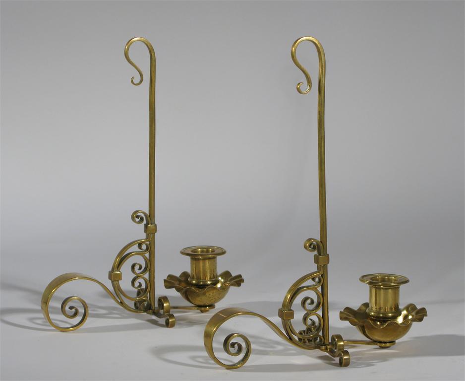A pair of brass candlesticks, scrolling form with floriform sconce, unsigned 29 cm. high