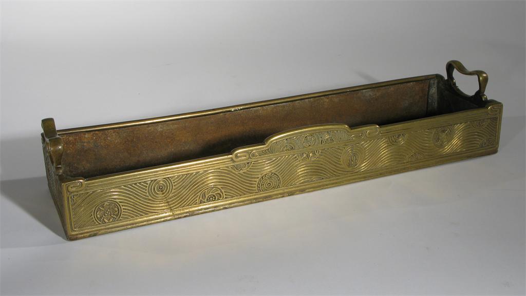 A Barnard, Bishop and Barnard bronze twin-handled ashes pan designed by Thomas Jeckyll, rectangular, cast in low relief with Mon design stamped registration diamond, 46.5 cm. wide