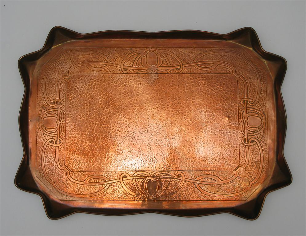 A large copper tray rectangular with up turned rim, decorated in low relief with a band of Celtic knot motif on simulated hammered ground unsigned 58 cm. wide
