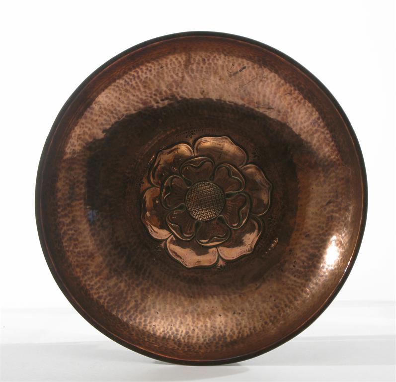 A Hart & Huyshe copper dish circular, repousse hammered with a Tudor rose medallion stamped Hart & Huyshe, Campden Glos 27.5 cm. diam.