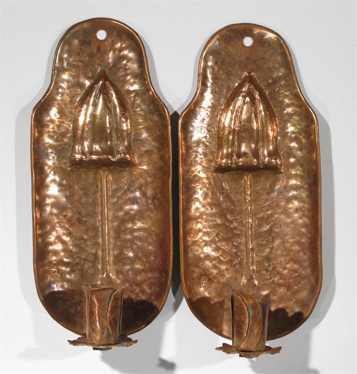 A pair of copper wall sconces each with curved back plate stamped in low relied with a bell...