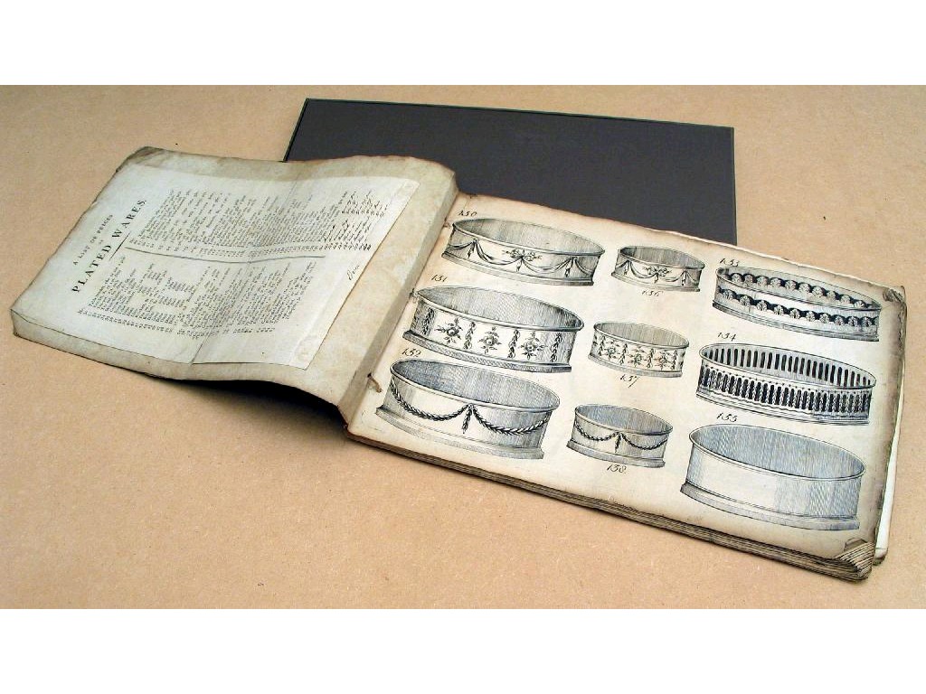 A bound catalogue of Old Sheffield plated designs, for holloware with a price list pasted into the front paper, no maker's details - c.1790 (contained in a cardboard cover).