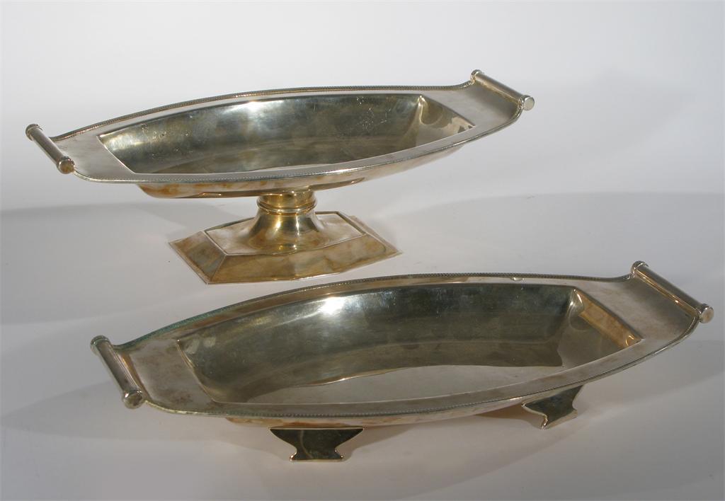 A Viners electroplated metal tazza and low dish swollen rectangular section with bar handles...