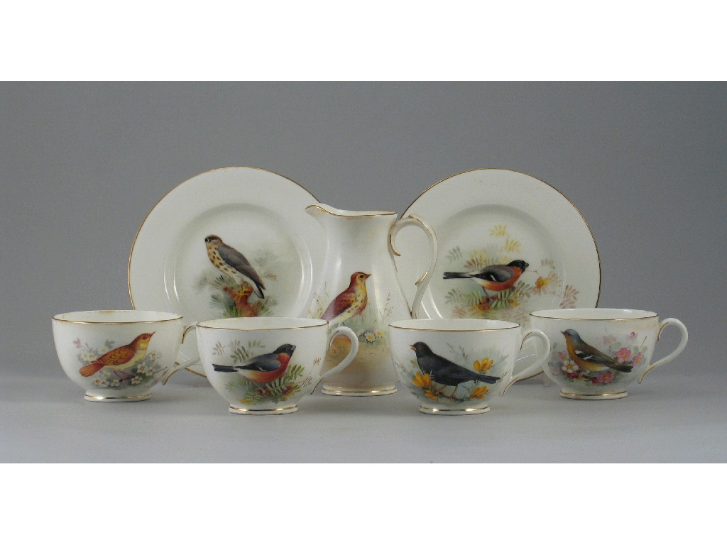 A Royal Worcester part tea service, each piece painted with a bird and signed 'Powell'. Some faults. All c.1917 except the small jug (1915), comprising: nine cups and saucers, nine small plates, two dishes, a bowl, a large and a small jug. (32)
