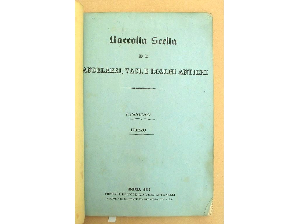 An Italian softbound catalogue "Raccolta Scelta di Candelabra, vasi e rosoni antichi" Roma 184 Presso L'Editore Giacomo Antonelli.