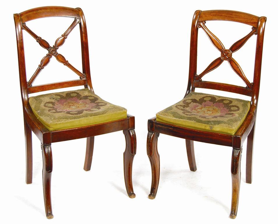 Two early 19th century mahogany side chairs, with 'X' shaped splats and drop in seats with needlework upholstery, on lappet carved scroll legs. (2)