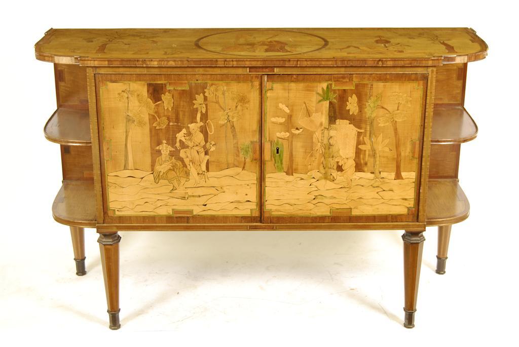A late 19th century continental marquetry side cabinet, the breakfront top with a central roundel with a group of figures in a garden landscape, flanked by two musicians and trees above a pair of doors with further figures enclosing an adjustable shelf, the bow ends with two shelves, on faceted tapering legs, 36.25in (92cm) h, 57in (145cm) w, 20in (50.5cm) d.