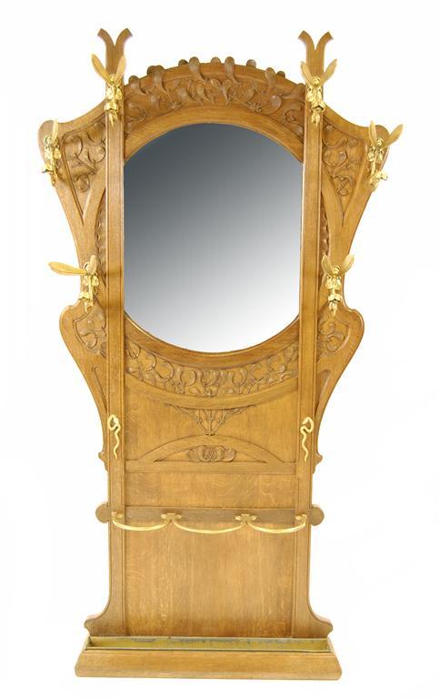 An Art Nouveau oak hall stand retailed by Goumain Freres, Paris, the bevelled mirror to a foliage carved frame and ormolu hooks modelled as dragonflies resting on a flower, the base with a lift-out tin tray, the side with an inset metal plaque inscribed 'GOUMAIN FRERES, Successeurs de leur Pere, FABRICANTS, 54, Rue de Charonne, Paris', 90in (229cm) h, 47in (119.5cm) w.