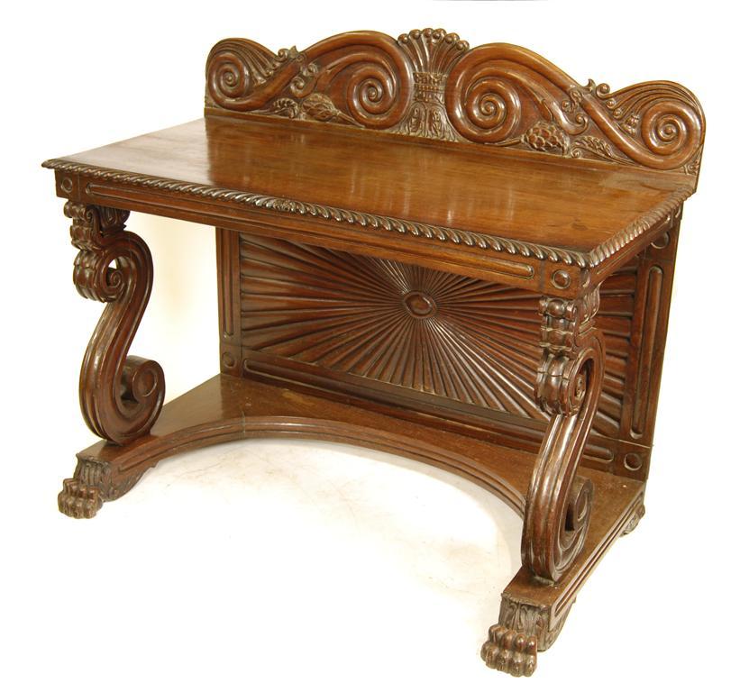 A mid 19th century Anglo-Indian carved rosewood console table, with a raised back and a leaf and gadroon edge, on 'S' scroll supports and a concave base with a radiating fluted back panel, on paw feet, 39.75in (101cm) h, 47.25in (120cm) w, 25.5in (65cm) d.