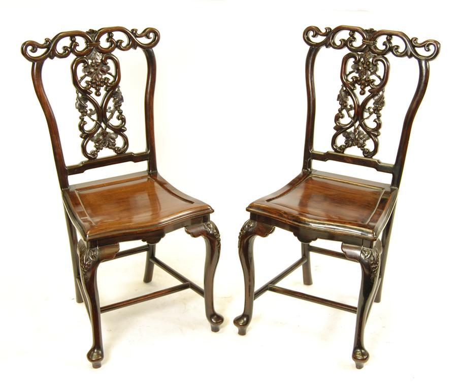 A pair of Chinese hardwood side chairs, each with a pierced top rail above a leaf and berry splat, on cabriole legs united by an 'H' stretcher, 19th century. (2)
