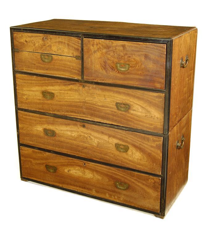 A 19th century Anglo-Indian camphorwood secretaire military chest, in two halves with ebony mouldings, with two short drawers, the left fitted with a hinged writing slope, compartments for pens and inkwells and pigeon holes, the lock stamped 'CHUBB'S PATENT, 57 ST PAULS CHYD, LONDON, CHUBB & SON, MAKERS TO HER MAJESTY, 533109', above three long drawers, with sunken brass handles and side carrying handles, 44.25in (112.3cm) h, 43.5in (110.5cm) w, 20in (51cm) d Losses to mouldings.