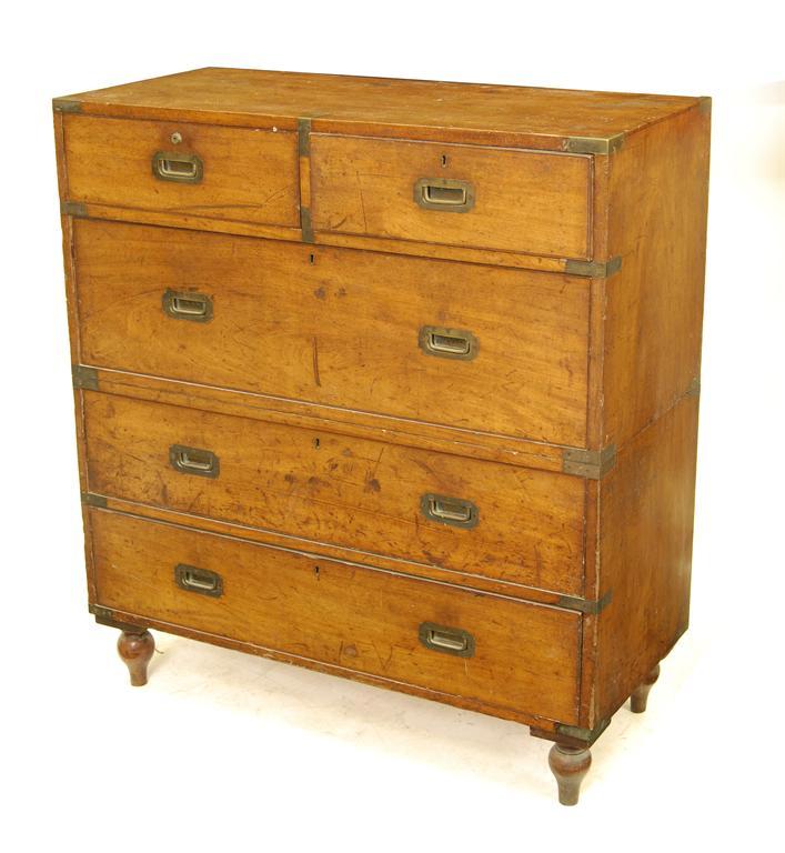 A 19th century mahogany and brass bound military chest, in two halves, having ash lined drawers and brass locks (one missing), one stamped 'HILL & MILLARD, MILITARY OUTFITTERS, 7 DUNCANNON STREET, LONDON W2', on turned feet, 43in (109cm) h, 39in (99cm) w, 18in (45.5cm) d. Wear.