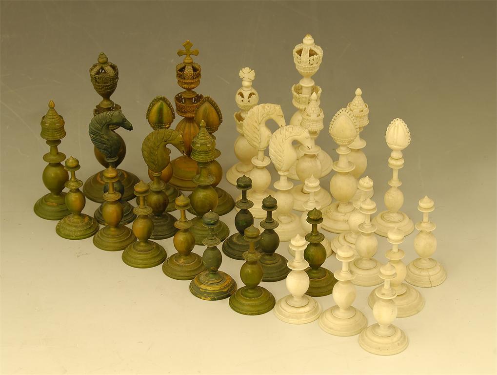 An Indian turned and carved ivory chess set, natural and green stained, the white king 4.25in (10.8cm) h, the pawns 2.25in (5.6cm) h, 19th century. Damages and replacements. (33)