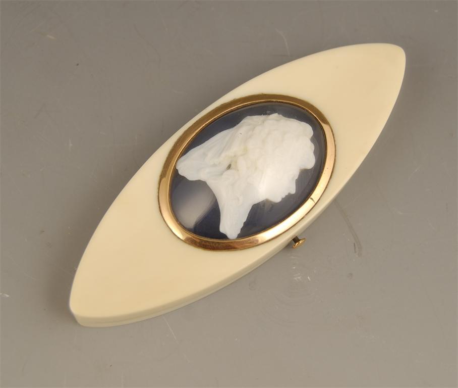 A George III ivory patch box, of navette form, the hinged cover inset a sulphide portrait bust of Sarah Siddons, with an inset mirror and plush lining, 4in (10cm) l.