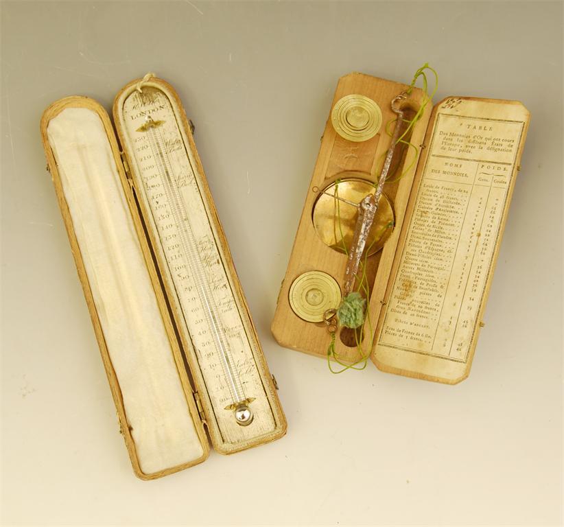 A 19th century silvered brass thermometer, inscribed 'M WOLLER LONDON', the scale marked minus 20 - 230, 8.25in (21cm) l, in a fitted red leather case, and a pair of French steel and brass hand held scales in a fitted wood case with weights and a printed table. (2)