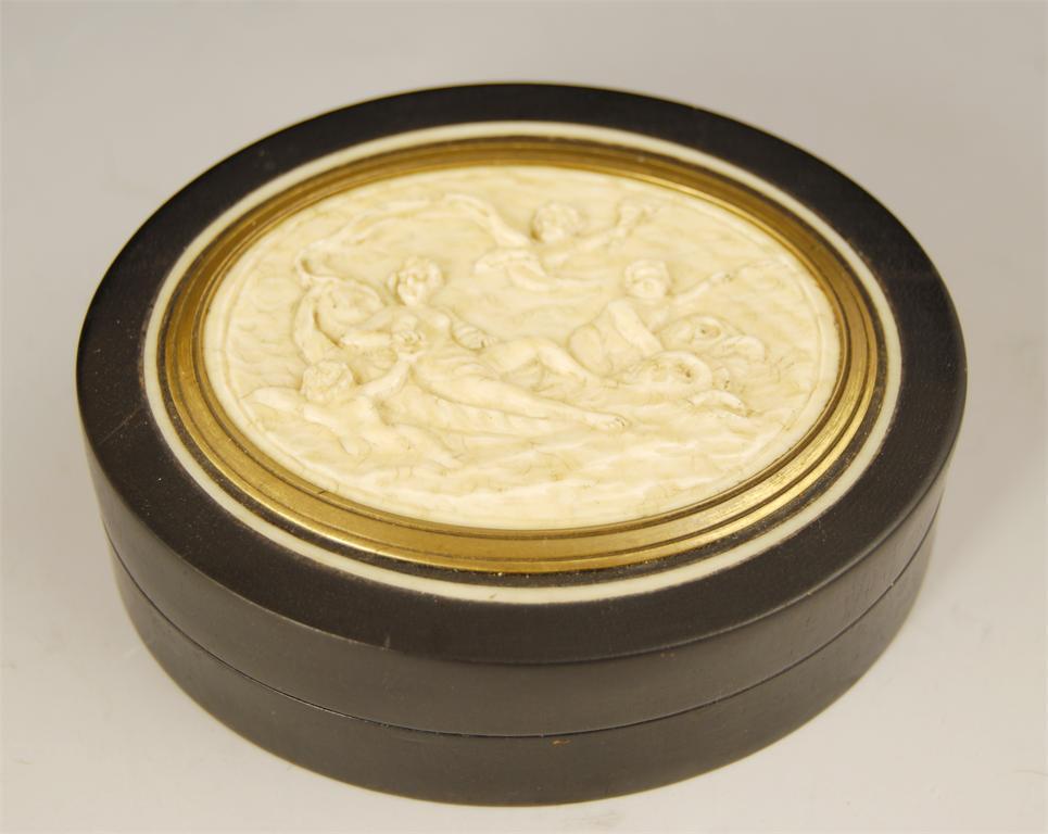 A late 19th century oval ebony snuff box, with an inset carved ivory panel depicting Venus in a dolphin drawn sea chariot, 3.25in (8.3cm) w.