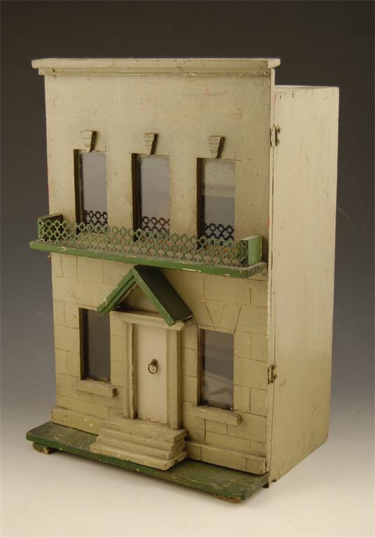 A painted wood dolls house, of a two storey balconied building, with a two room interior, 19in (48cm) h, 12.5in (32cm) w, 9in (23cm) d.