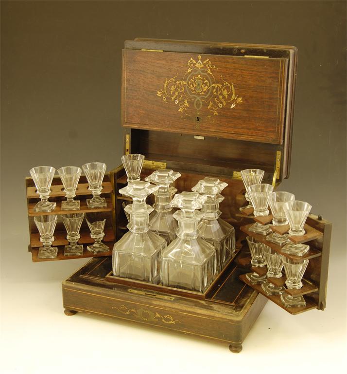 A 19th century French rosewood and brass, pewter and mother of pearl marquetry tantalus, containing four decanters and thirteen stem glasses, 10.25in (26cm) h, 12.5in (32cm) w, 9.75in (24.8cm) d.