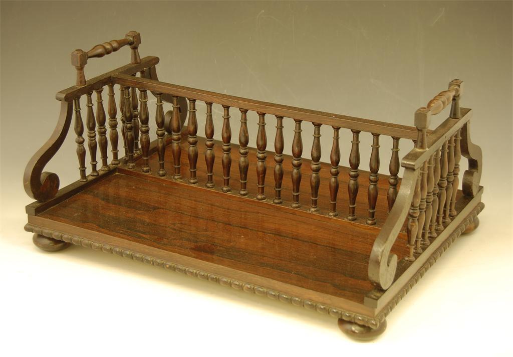 A William IV rosewood bookrack, with turned spindles and scroll supports, the underside with printed label for 'C. HANSON CABINET MAKER, AND UPHOLSTERER, PAPER HANGER, &C, &C, BINGLEY', 7.75in (19.6cm) h, 16.25in (41cm) w, 12.25in (31cm) d. Restoration