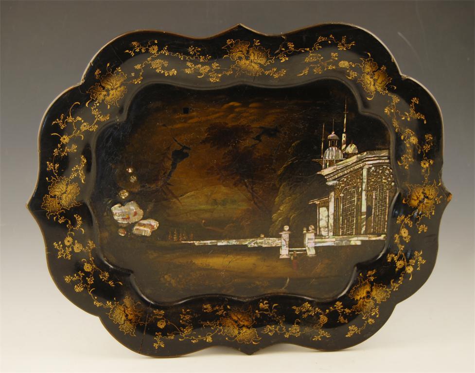 A 19th century papier-mache tray, the centre with a mother of pearl inlaid summer palace and painted landscape, 13.75in x 16.75in (35cm x 42.5cm). Splits and chips.