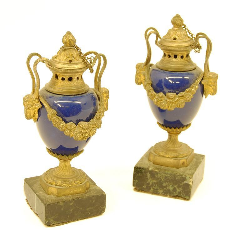 A pair of late 19th century French pastille burner vases, with blue glazed ceramic bodies and gilt brass mounts, with pierced necks and covers, 5.25in (13.2cm) h. (2) Chips to marble base, gilt worn.