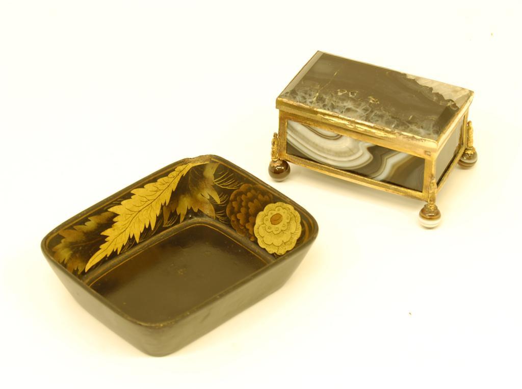 A 19th century onyx gilt copper mounted box, the hinged cover on turned feet, 1.75in (4.5cm) h, and a 19th century papier-mache counter tray. (2)
