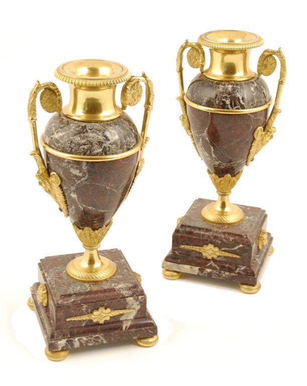 A pair of late 19th century French breccia marble urns, with gilt brass mounts raised on stepped bases with ovoid bodies and waisted necks and floret terminal handles 11.5in (29cm) h (2).