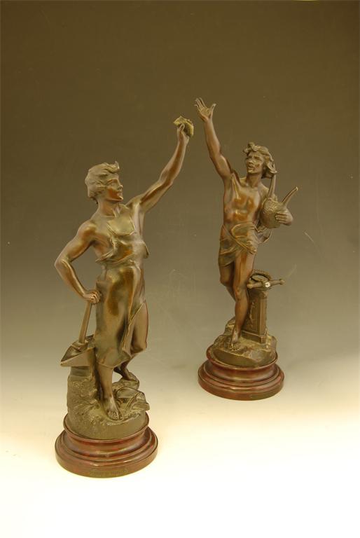 A pair of spelter figures after J. B. Germain, 'Chant du Travail' and 'Chant Patriotique', each signed and with fabrication pastille, on turned simulated marble bases with applied title plaques, late 19th / early 20th century, 20in (50.7cm) h. (2) Damages, sword hilt lacking.