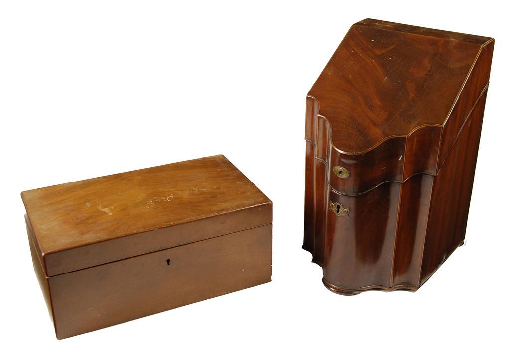 A George III mahogany serpentine front knife box, with a inverted stationary interior, 14.75in (37.5cm) h, and a mahogany veneered cigar humidor with an adjustable divided interior 13.5in (34.2cm) w. (2)