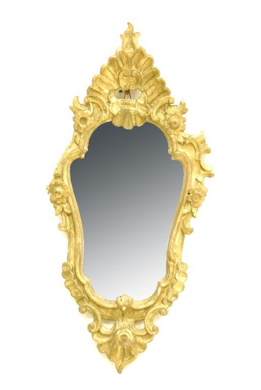 A pair of 18th century Italian giltwood and gesso cartouche shape girandoles