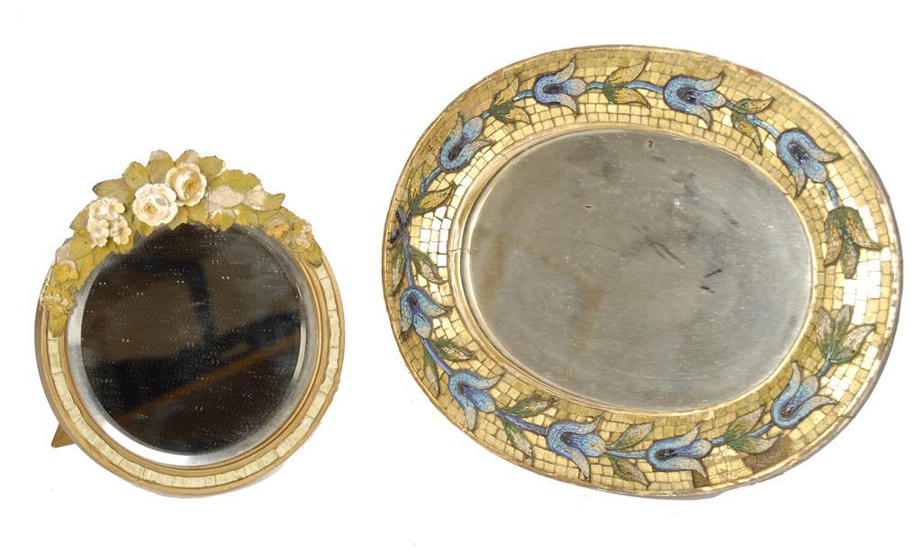 An Italian oval easel back mirror, with a floral mosaic and gilt ground border, 9.75 x 12.25in (25 x 31cm) and a circular Barbola frame mirror. (2)