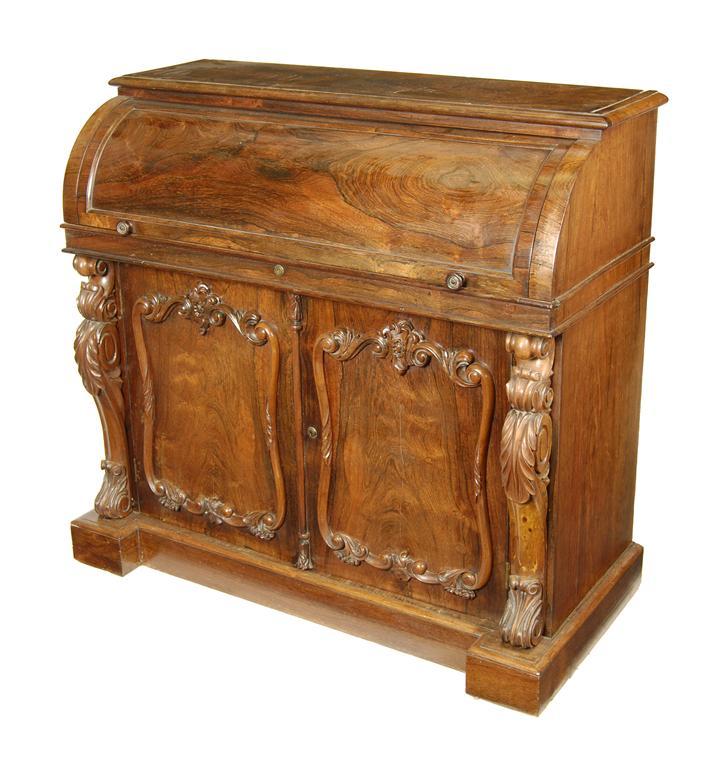 An early Victorian rosewood cylinder desk, previously with a superstructure, the interior with a pull-out surface with a hinged and ratcheted slope, having inset leather panels, to pigeon holes and maple veneered drawers, the base with a pair of cupboard doors with applied carved moulding enclosing a shelf, having brass Bramah locks, 39.75in (101cm) h, 43in (109cm) w, 20.25in (52.8cm) d.