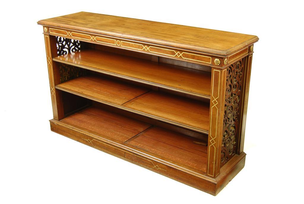 An early Victorian mahogany and parcel gilt open bookcase, in the manner of Richard Bridgens, the moulded edge top previously with a supra-structure, above two shelves, the pierced fret panelled sides with worn silk panels, one missing and half-length pull-out slides, 35.75in (91cm) h, 59.5in (151cm) w, 17in (43cm) d. Central division missing, damages to fret work.