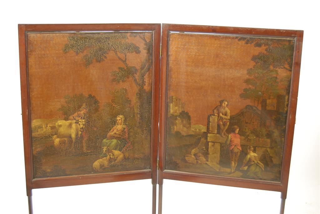 A mahogany two fold commode screen, inset painted leather panels decorated romantic pastoral scenes with figures, 46.75in (118.5cm) h, 21in (53,2cm) w, each panel.