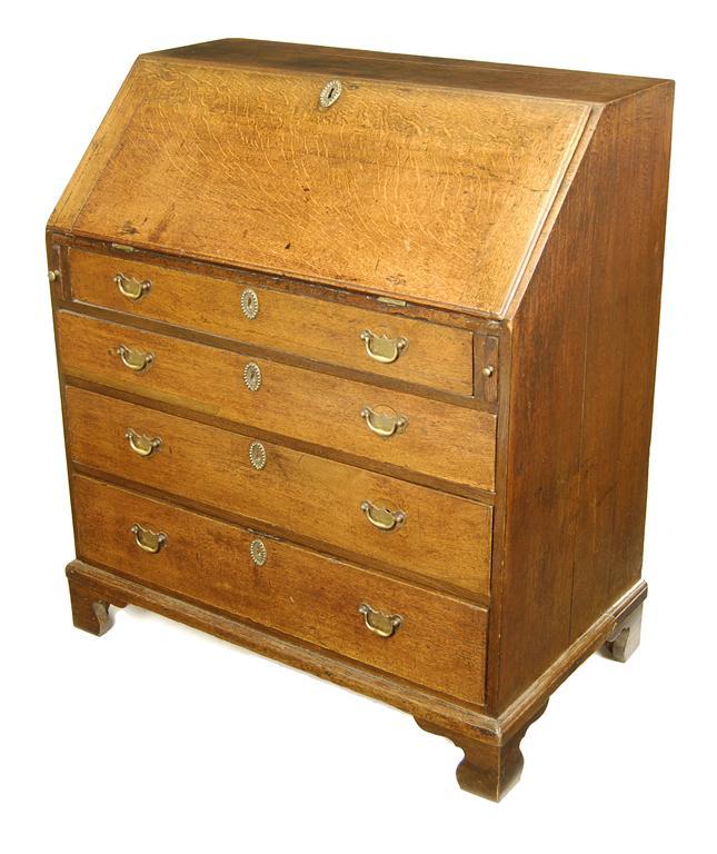 A George III oak bureau, the hinged fall to a fitted interior of pigeon holes and drawers, above four long graduated drawers, with later metalwork and replaced bracket feet, 40.25in (102cm) h, 36.5in (92.5cm) w, 20.75in (52.6cm) d.
