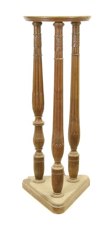 A mahogany torchere, with turned and carved supports to a triangular base and wooden castors, 56.25in (142.7cm) h, 19.5in (49.5cm) dia. One corner section of base missing.