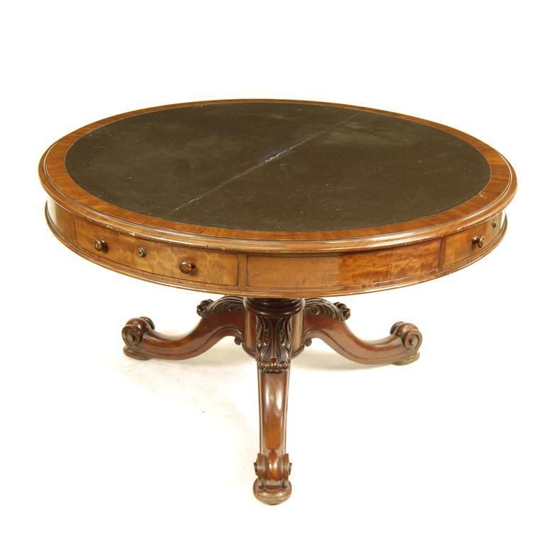 A William IV mahogany drum table, the moulded edge revolving top above four drawers, the brass locks stamped 'J. BRAMAH, 124 PICCADILLY', on a baluster turned stem and leaf and scroll carved tripod supports and brass castors, 29in (73.5cm) h, 47in (119.2cm) dia. Top cracked.