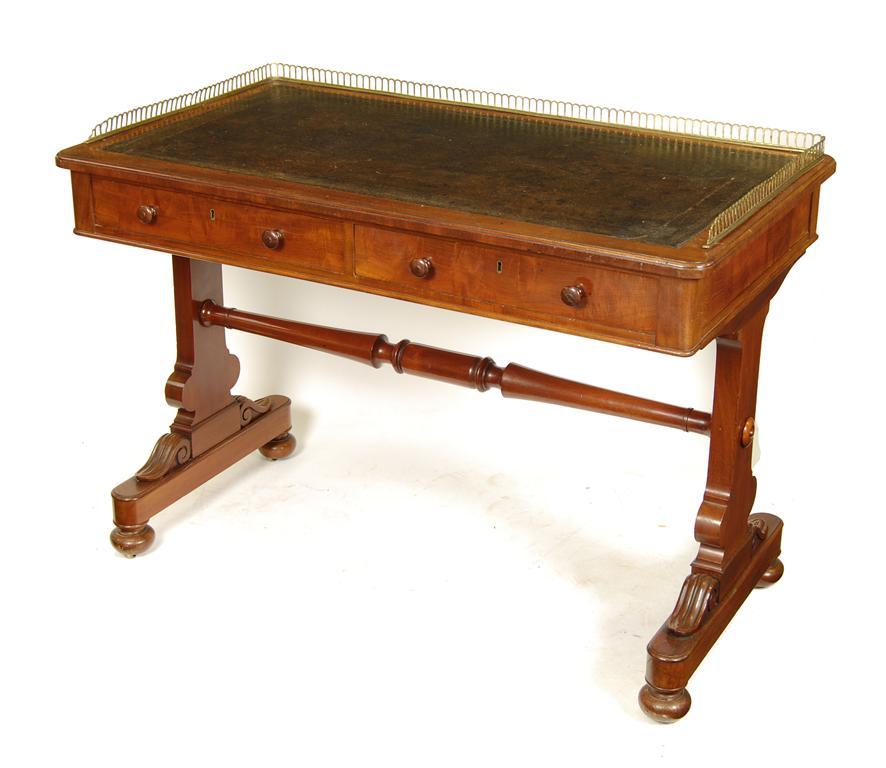 A Victorian mahogany writing table by Holland & Sons, the pierced gilt brass three quarter gallery to an inset leather top above two frieze drawers, one stamped 'HOLLAND & SONS', on solid ends united by a turned stretcher, on sunken brass castors, the brass locks stamped 'CLARKE & TIMMINS, BIRMm, VR crowned PATENT', 30.5in (77cm) h, 42in (106.5cm) w, 23.75in (60cm) d.
