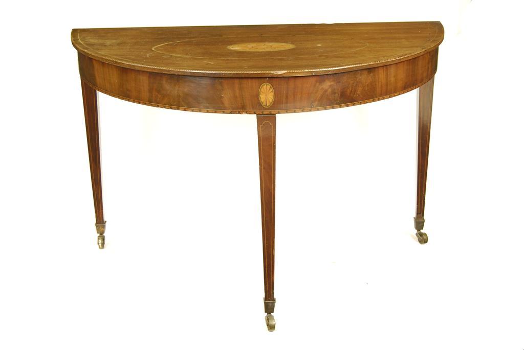 A mahogany demi-lune console table, inlaid stringing and marquetry, on square tapering legs to brass caps and castors, George III and later, 30.25in (76.5cm) h, 46in (117cm) w, 23.25in (59.3cm) d. Old damages and losses.