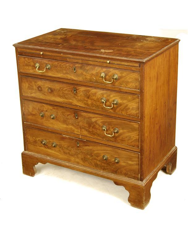 A mahogany chest, the crossbanded top with a moulded edge, above a brushing slide and four graduated drawers, on shaped bracket feet, 31.25in (79.2cm) h, 31in (79cm) w, 18.25in (46cm) d. Cracks, old damages, replacements and restorations.