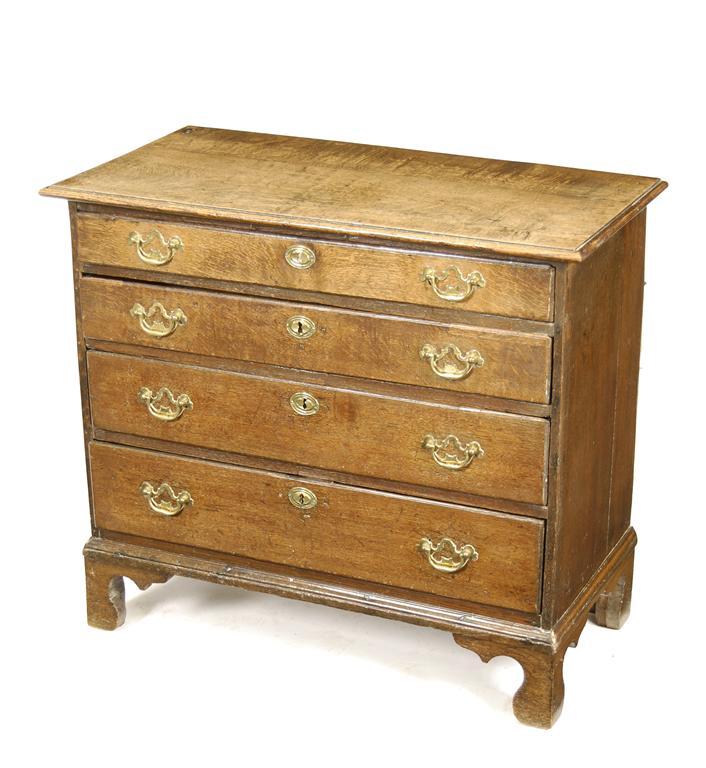 An early George III oak chest, the moulded edge top above four graduated drawers, on bracket feet, 28.25in (71.5cm) h, 32.25in (82cm) w, 16.75in (42.3cm) d.