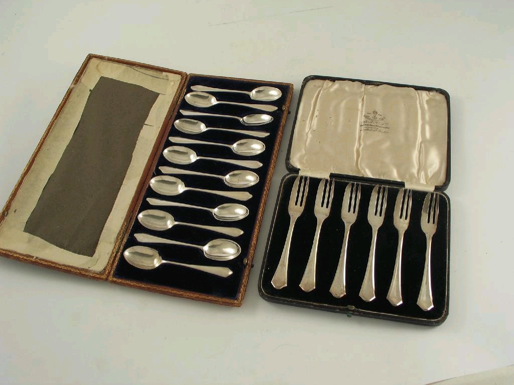 A cased set of twelve Edwardian dognose teaspoons, by Goldsmiths and Silversmiths Co Ltd, London 1909/1911, together with a cased set of six modern cake forks.