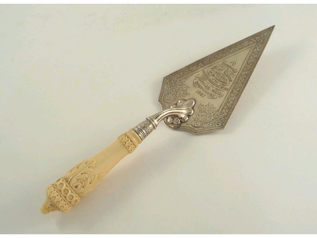 A Victorian engraved presentation trowel, inscribed "presented to Miss Evans of Forde Abbey on the occsion of her laying the foundation stone of the Jubilee Hall, Thornecombe 1887", carved ivory handle, by Edward Hutton, London 1886.