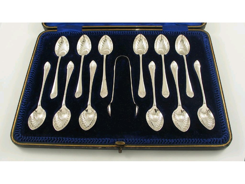 An Edwardian cased set of twelve teaspoons, and a pair of sugar tongs, with shell bowls, by Joseph Rogers, Sheffield 1905/6.