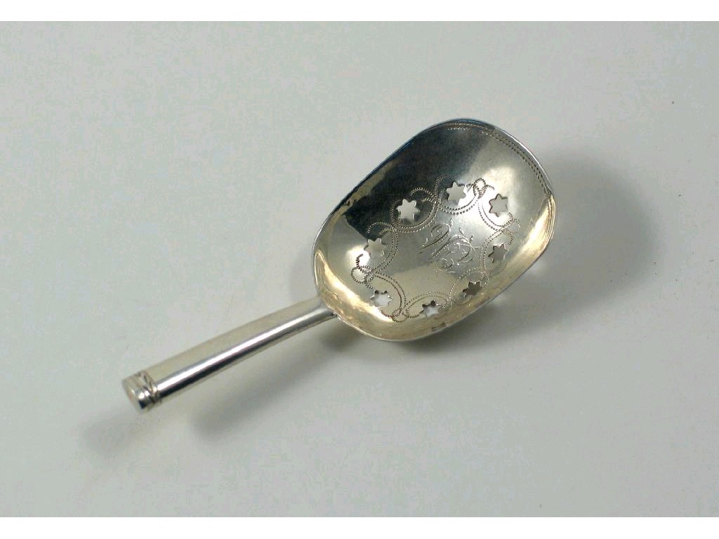 A George III caddy scoop, with a hollow tubular handle, the bowl pierced with eight mullets and initialled by Joseph Taylor, birmingham 1805.