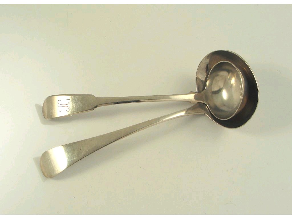 A Victorian Scottish provincial fiddle toddy ladle, initialled "H", by A. Davidson (of Arbroath) with Dundee marks (AD, pot of lilies [thrice]) c.1840 and a Birmingham - made sauce ladle, Old English pattern, by Edward Thomason 1823, 2.25oz. (2)