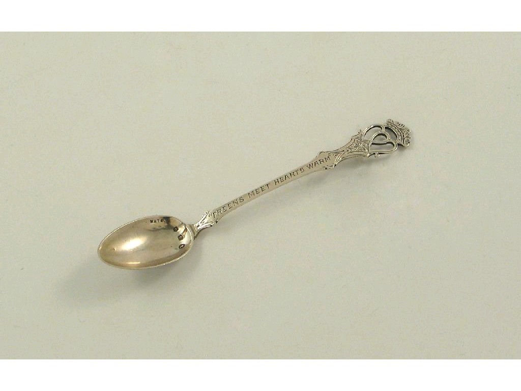 A late Victorian Scottish provincial tea spoon, inscribed " FREENS MEET HEARTS WARM ", below a Luckenbooth terminal, by W. Robb of Ballater with Edinburgh marks for 1900.