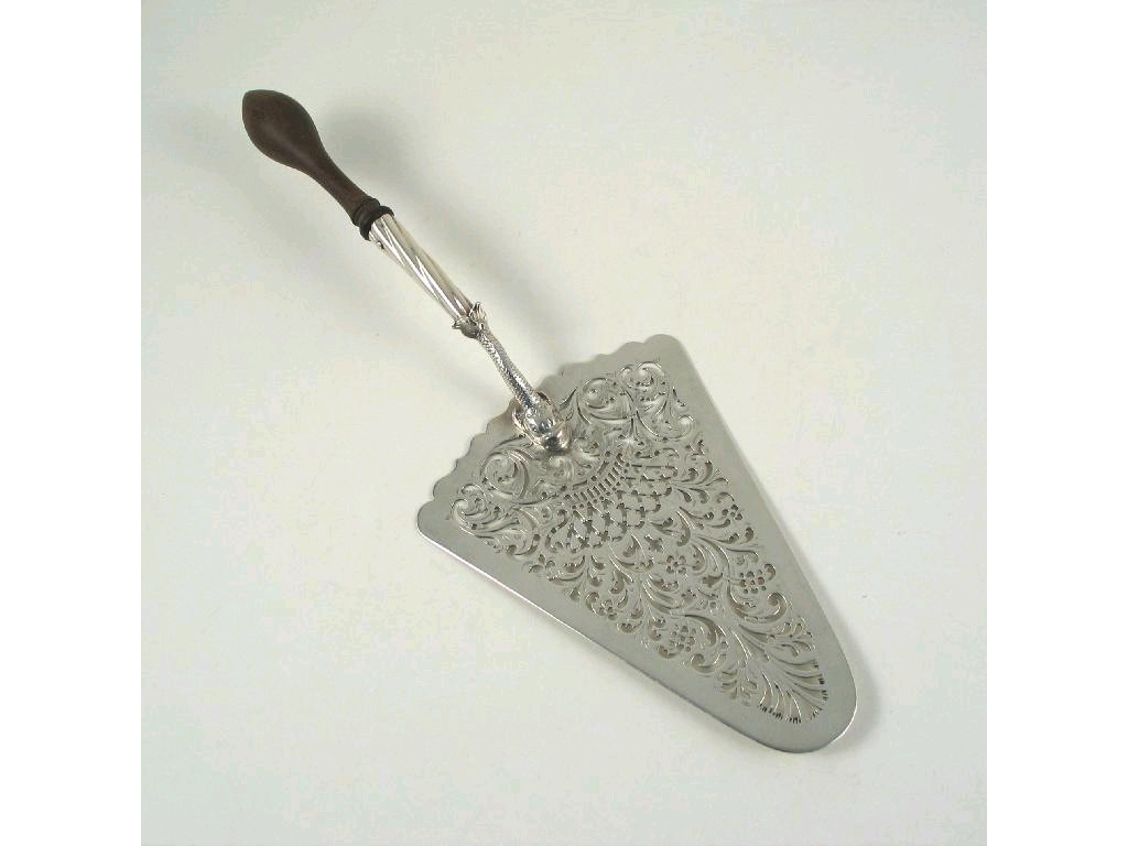 A late George III triangular fish slice, with a part writhen and part turned wooden handle, culminating in a cast dolphin where it meets the blade, pierced with a stylised basket of flowers and scrolls, by Bavage?? Davenport, London 1759, 11.6in (32cm) 4.5oz gross.