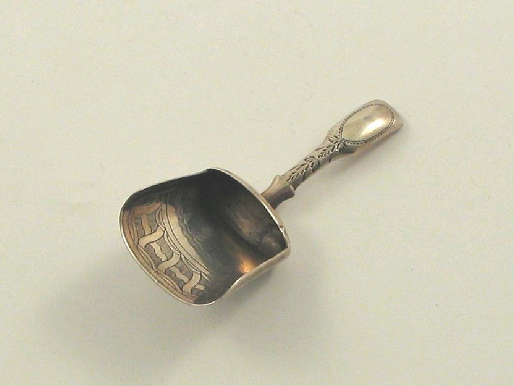 A caddy spoon and miscellanea: A George III engraved caddy shovel with a hollow fiddle stem by Joseph Taylor, Birmingham 1812 together with a cased set of six feather edge teaspoons, three antique condiment spoons, a pair of small sugar tongs and a small quantity of plated ware.