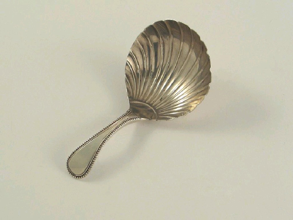 A George III period caddy spoon, with a large fluted circular bowl and a bead pattern handle, makers mark J.I.? and another indistinct mark, probably provincial, unascribed.